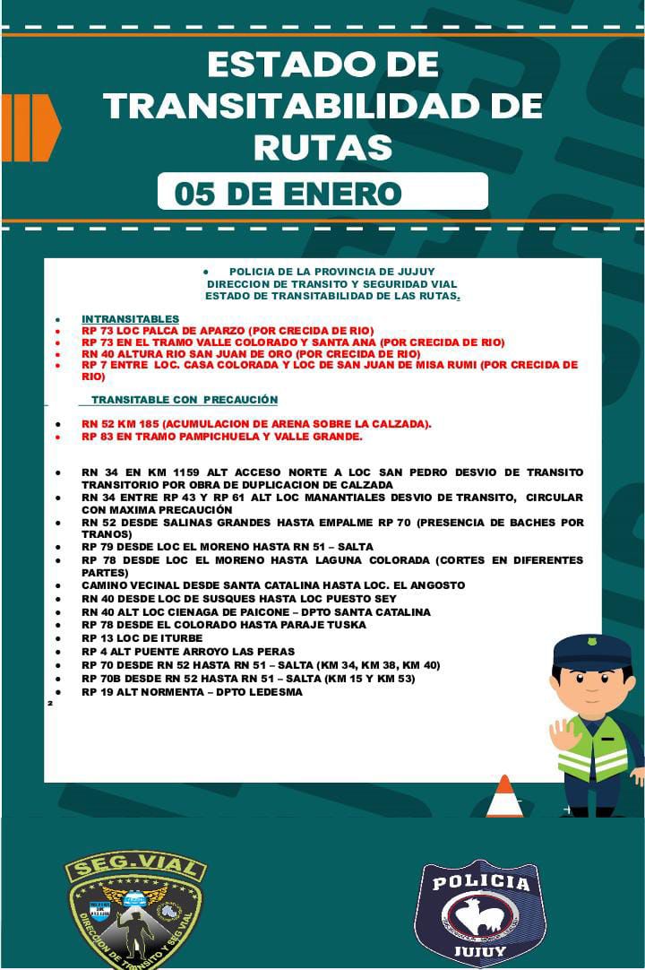 Luego de las intensas lluvias que cayeron en las últimas horas en distintos puntos de la provincia de Jujuy, Seguridad Vial dio a conocer este lunes 5 de enero a través de sus redes oficiales el estado de las rutas. Se recomienda a los conductores locales y visitantes tener en cuenta esta información para evitar inconvenientes.
