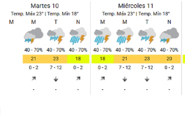 El organismo anunció alerta amarilla por tormentas para la tarde - noche del martes y miércoles 11 en un amplio sector de la provincia. Esto significa "posibles fenómenos meteorológicos con capacidad de daño y riesgo de interrupción momentánea de las actividades cotidianas", según el SMN.