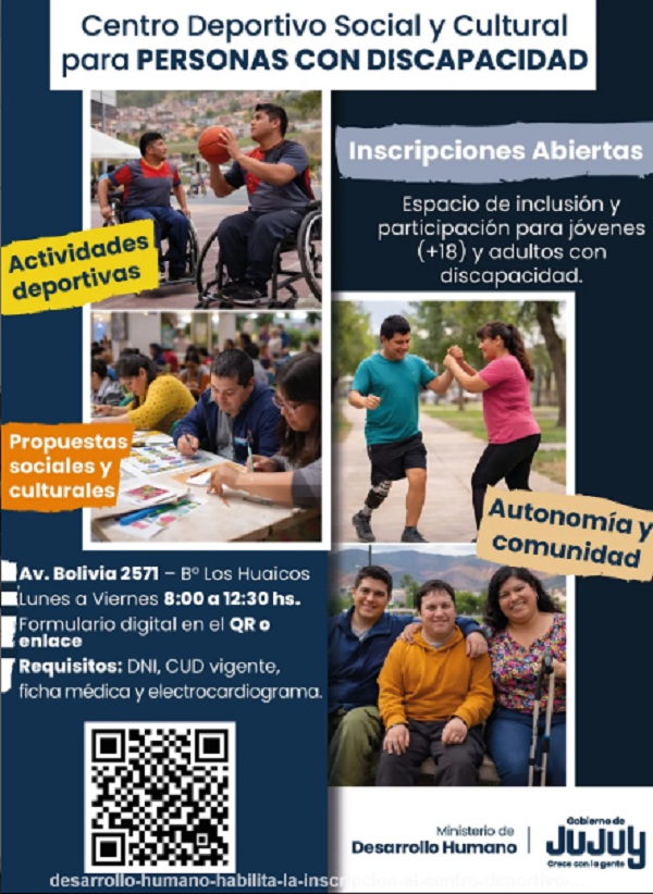 Se encuentra abierta la inscripción al Centro Deportivo Social y Cultural destinado a personas con discapacidad mayores de 18 años, informó el Ministerio de Desarrollo Humano.